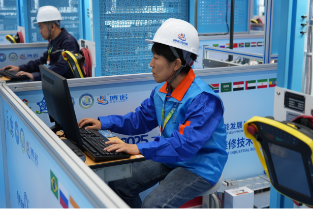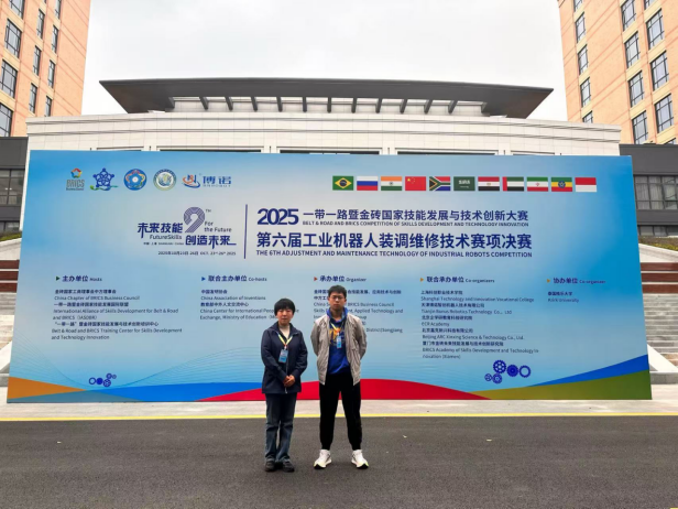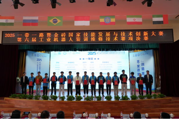 在上海举办的2025年第六届“一带一路暨金砖国家技能发展与技术创新大赛”工业机器人装调维修技术赛项决赛中,我院师生表现卓越,斩获多项荣誉,并成功晋级2026年摩洛哥北非国际赛,并将代表中国角逐国际赛场。