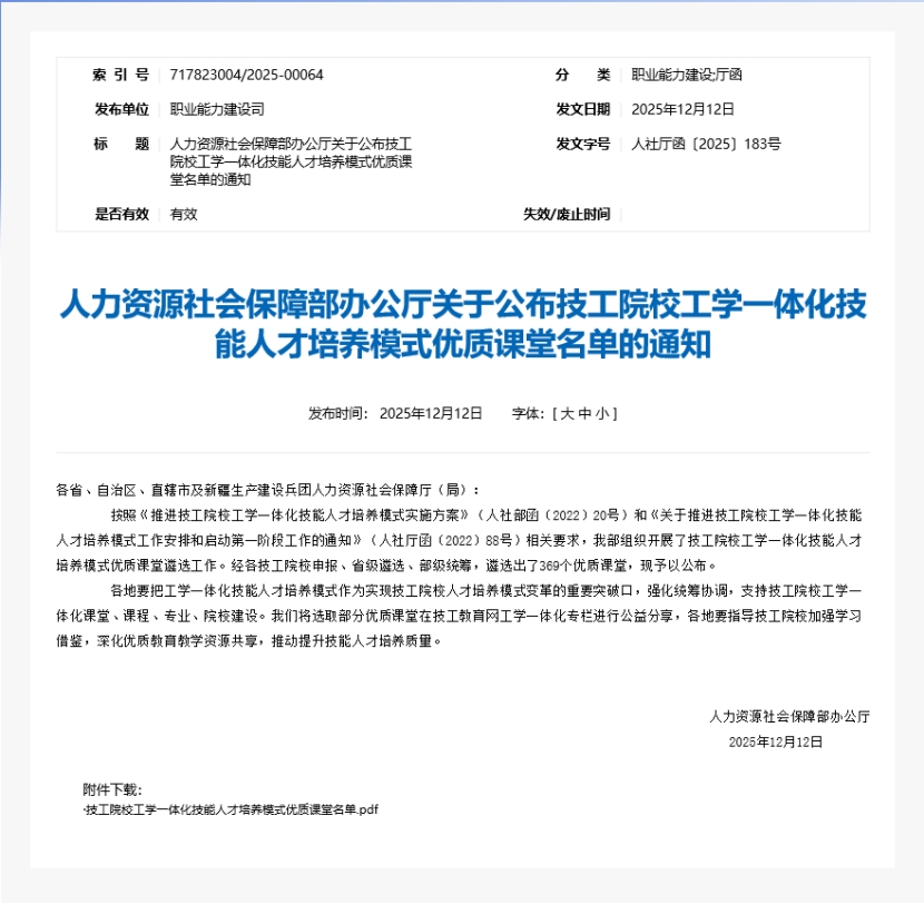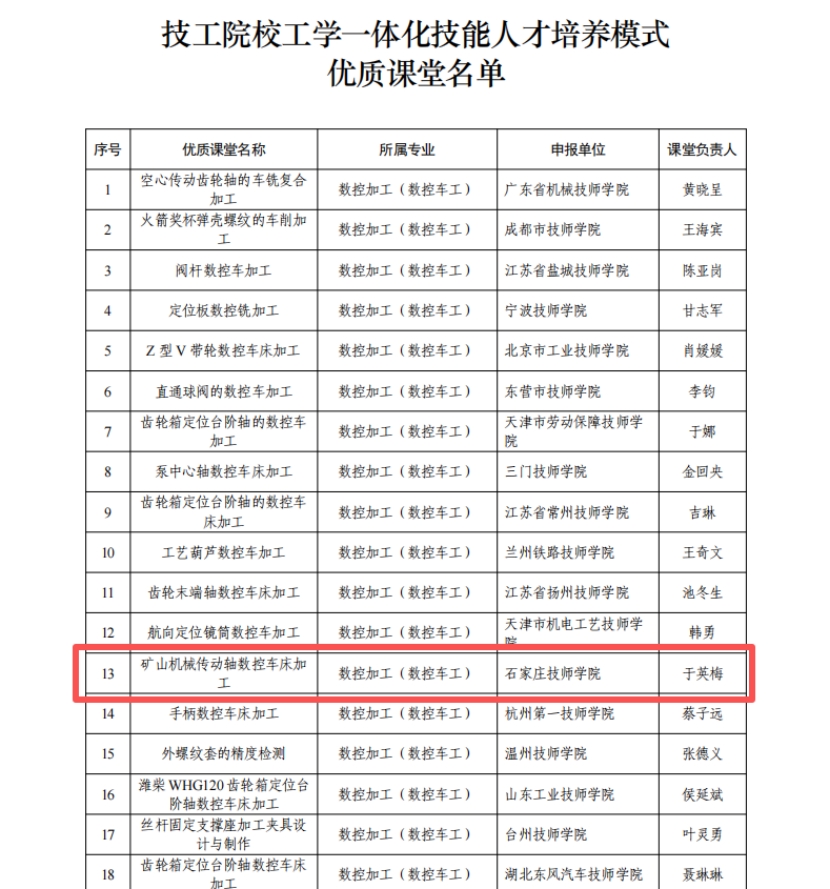 近日,人力资源社会保障部办公厅发布了《关于公布技工院校工学一体化技能人才培养模式优质课堂名单的通知》(人社部函〔2025〕183号),石家庄技师学院“矿山机械传动轴的数控车床加工”工学一体化课成功入选,这是学院历史首次荣登国家级优质课堂榜单!