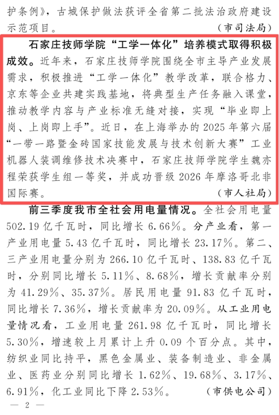 昨天,《石家庄在行动》刊发两篇石家庄技师学院办学成绩,一是“工学一体化”培养模式取得积极成效,二是我院3支参赛队在第三届全省电商创业大赛囊括前三名的优异成绩!