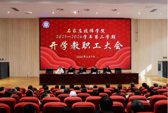 2026年3月7日上午,石家庄技师学院2025-2026学年第二学期教职工大会在学院报告厅隆重召开。院领导宋志宏、方建京、曹诚、康义艳、刘坤出席会议,大会由院长方建京主持,全体教职工参加。