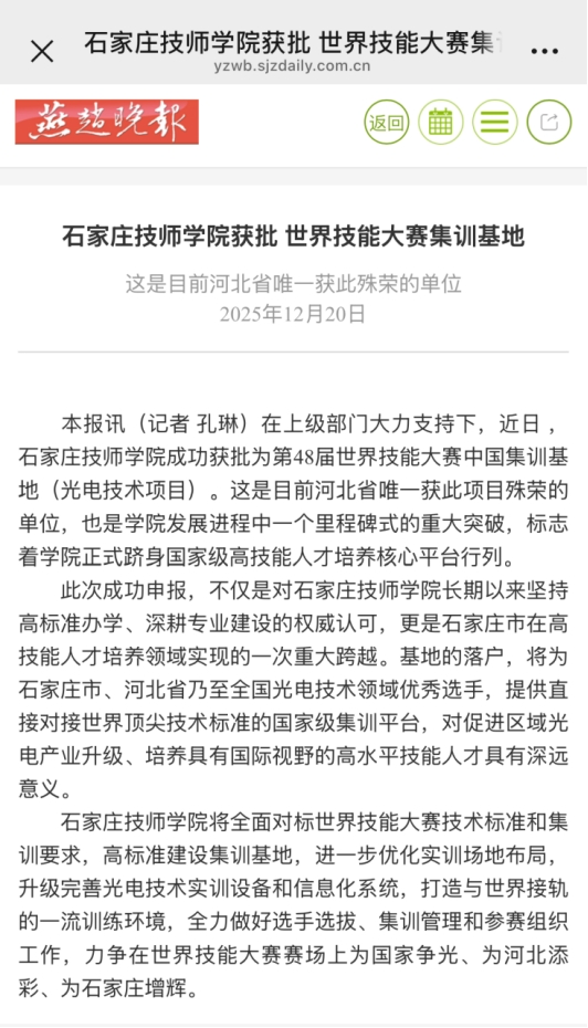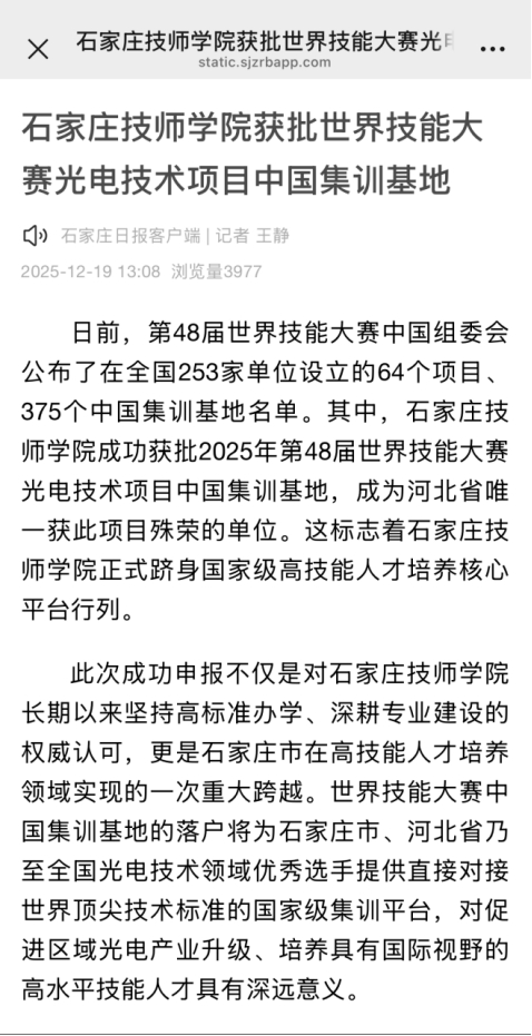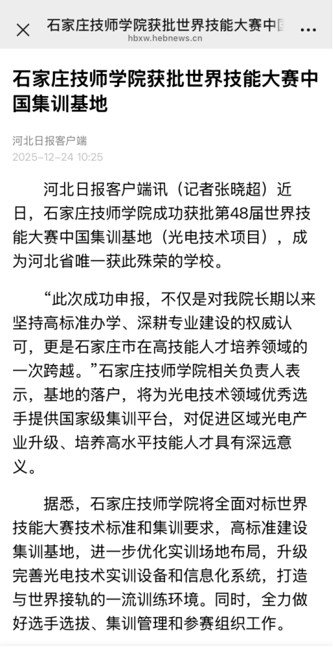 多家媒体报道石家庄技师学院获批世界技能大赛中国集训基地